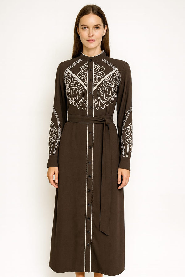 Bohemian Leaf Print Dress – Long Sleeve with Tassel Tie